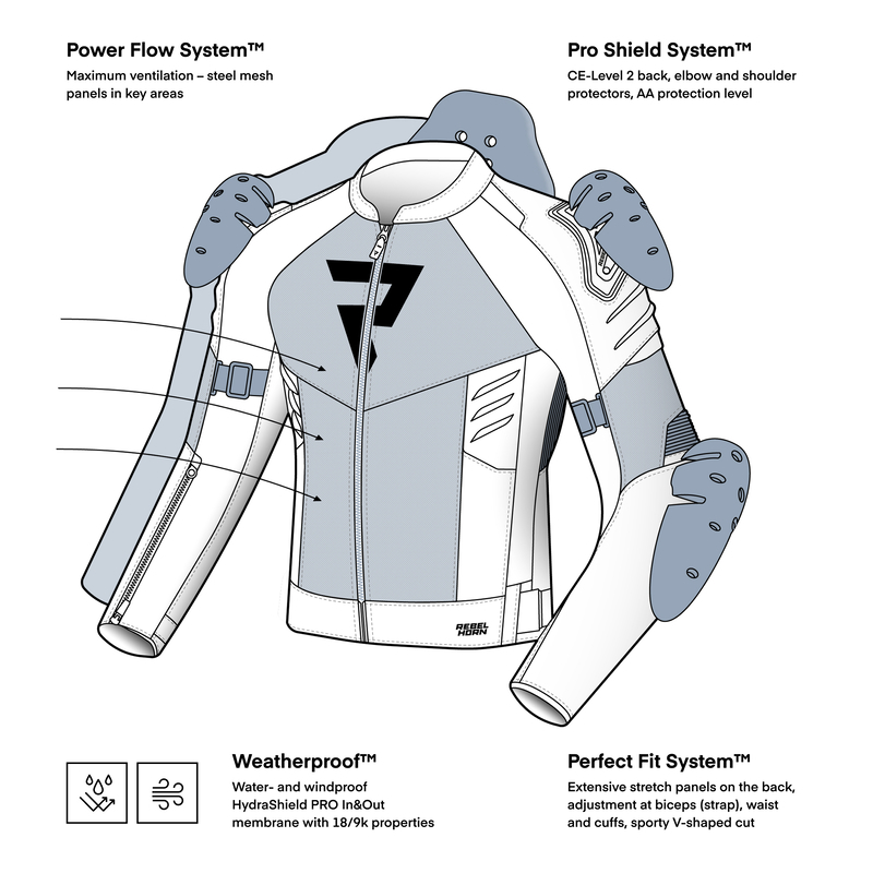 Rebelhorn Vandal II Air este geaca moto de vara cu ventilatie optima si protectii Nivel 2 incluse, combinand look-ul sport agresiv cu versatilitatea unei membrane impermeabile detasabile, ideala pentru oras si touring.