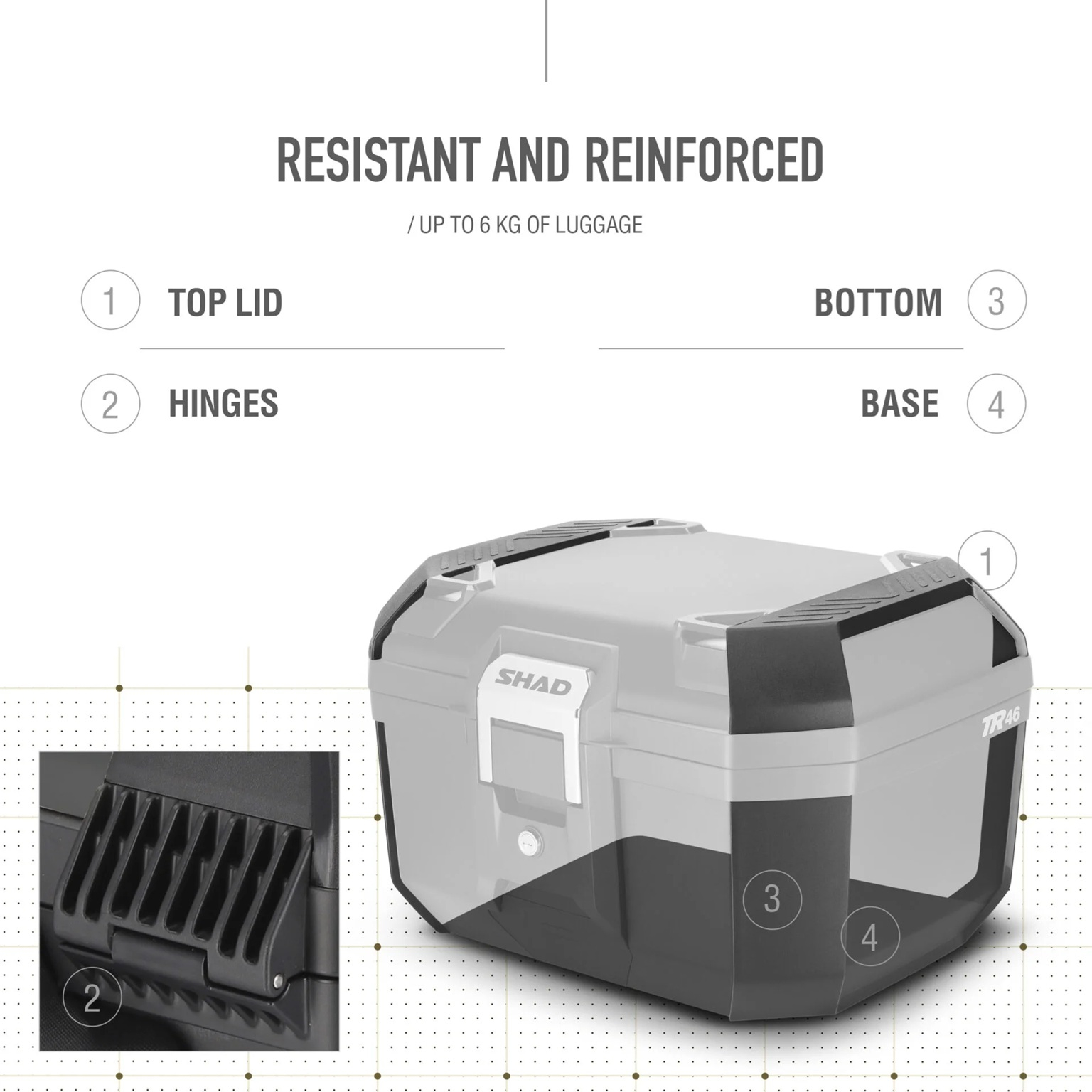 Cu o capacitate suficienta pentru doua casti (una integrala si una open face) si o sarcina maxima de 6 kg, TR46 este ideal pentru calatorii de zi sau ture mai lungi. Fabricat din polipropilena ranforsata, combina durabilitatea cu o greutate redusa, fiind usor de utilizat in orice situatie.