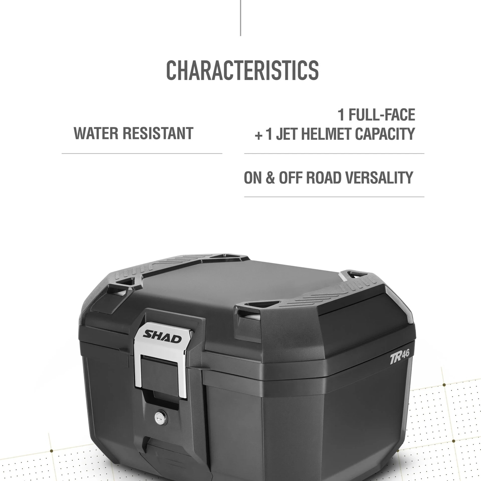 Top case-ul SHAD TR46 este proiectat pentru aventuri, fiind o solutie robusta si versatila pentru motociclistii care alterneaza intre asfalt si off-road. Datorita constructiei solide si designului ranforsat, ofera rezistenta ridicata si protectie excelenta pentru bagaje, chiar si in conditii dificile.