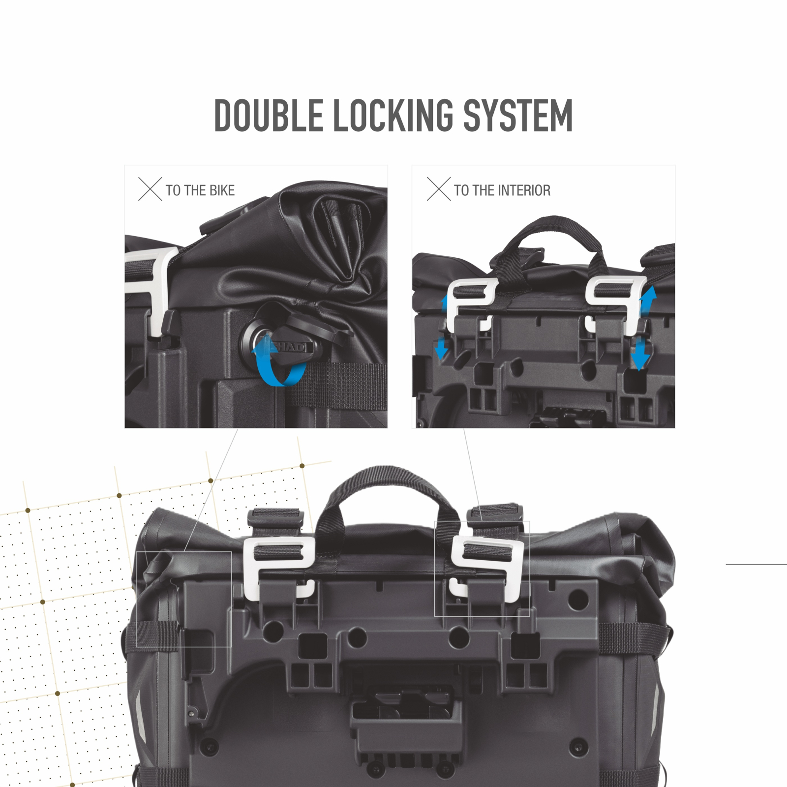The TR30 adventure saddlebags stand out for their IPX6 waterproof rating and their "Double Locking System" closure system (patent pending) to lock the bag to the 4P and 3P fitting and the bag itself, preventing inside access.